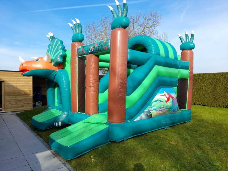 Op zoek naar een stoer Dino springkasteel in de regio Kortrijk? Dan is dit indrukwekkende springkasteel met glijbaan precies wat je nodig hebt! 🌋 Kinderen duiken in een prehistorisch avontuur vol dino’s, plezier en actie. Dankzij de geïntegreerde glijbaan 🛝 is fun gegarandeerd en wordt jouw feestje een gigantische hit!